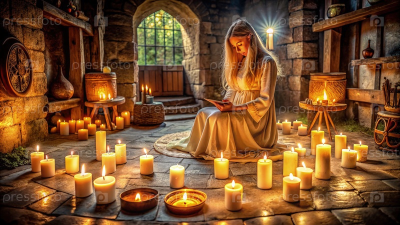 Женщина, зажигающая свечи в каменном подвале на закате