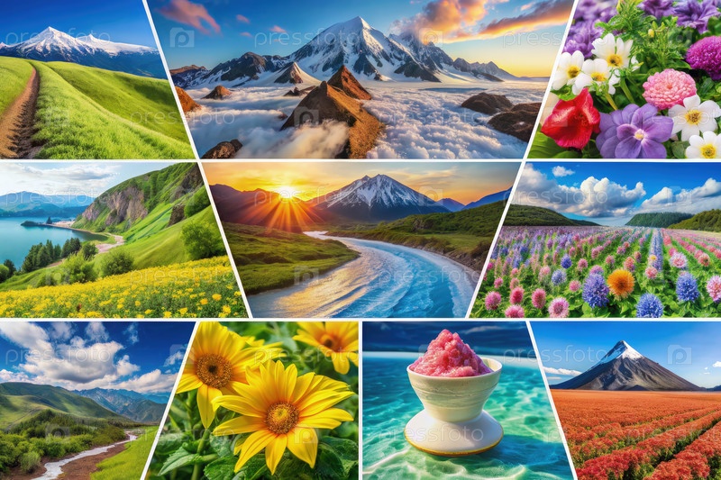 Летний коллаж живописных пейзажей и ярких цветов. генеративный ИИ