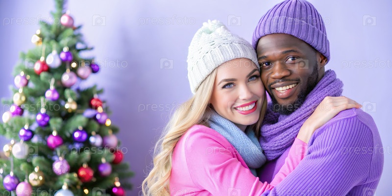 Счастливая пара обнимается перед украшенной рождественской елкой