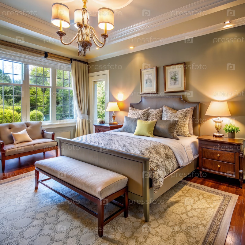 Отремонтированная спальня с большим окном и наполненной головкой