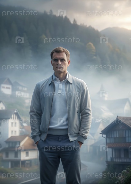 Человек, стоящий в туманной альпийской деревне