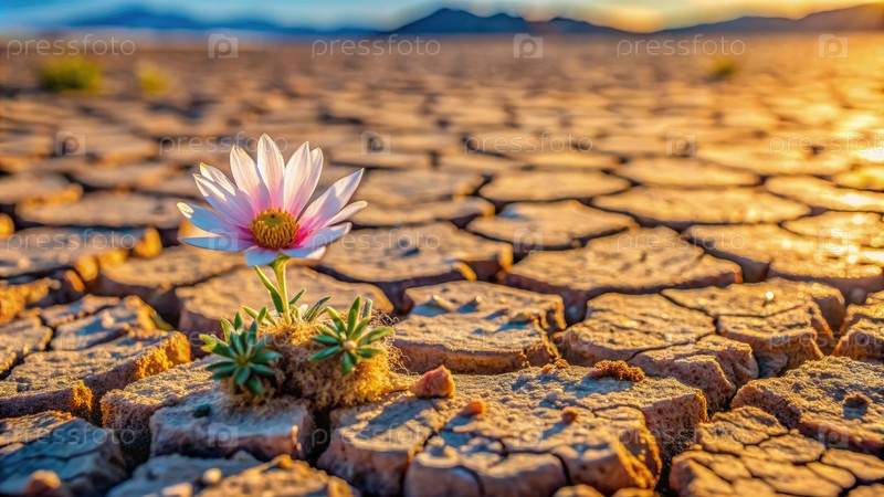 Нежный цветок расцветает среди трещины пустынной почвы на закате