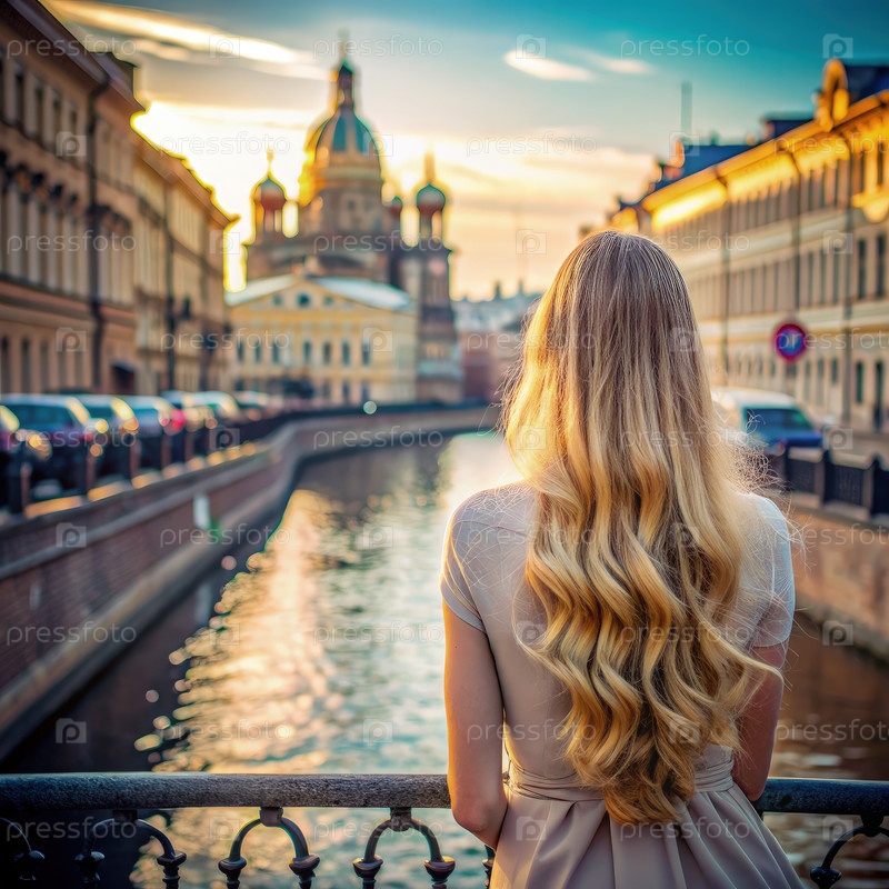 Блондинка восхищается закатом солнца над Санкт-Петербургским каналом