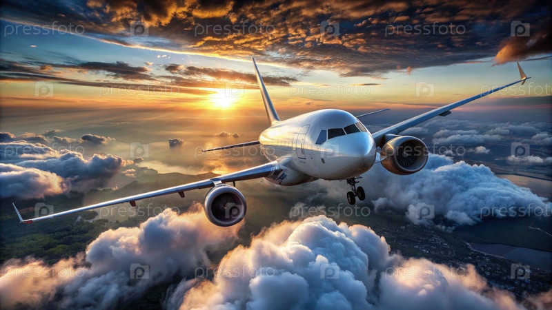 Самолет, летящий над облаками на закате