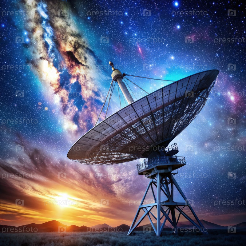 Большая спутниковая тарелка захватывает загадочный сигнал против звездного ночного неба
