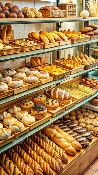 Свежевыпеченный хлеб и кондитерские изделия выставлены на деревянных полках в пекарне