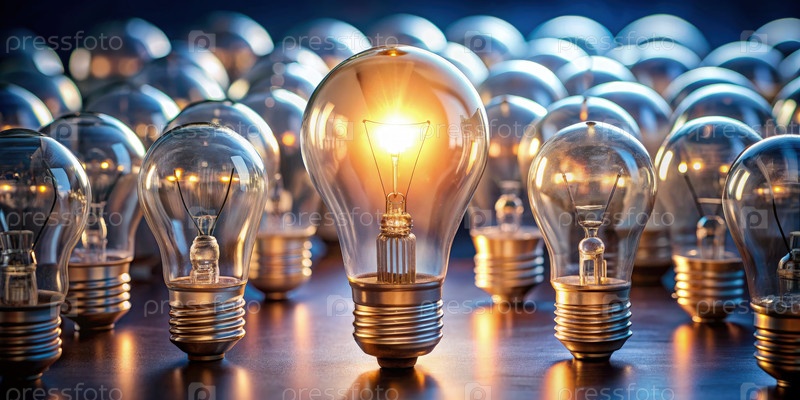 Одиночная освещенная лампочка среди группы незажженных лампочек на темной поверхности