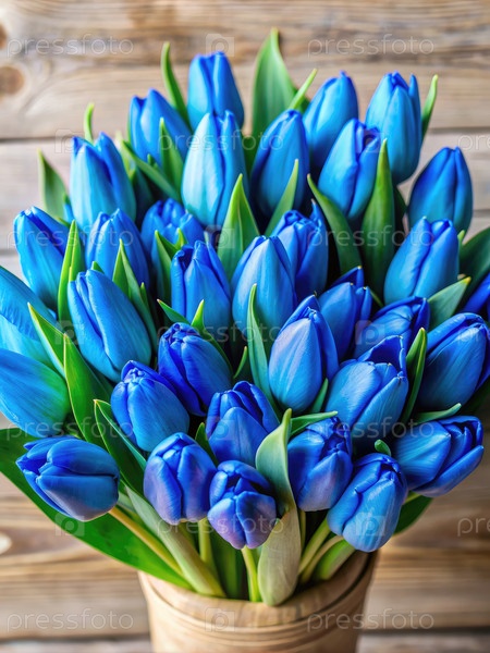 Букет голубых тюльпанов в деревянной вазе на деревянном столе