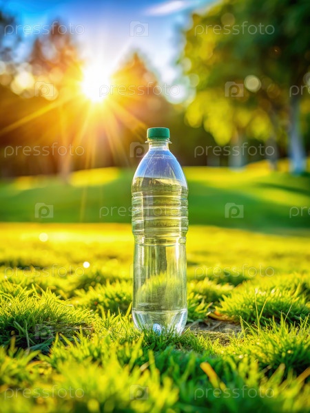 Бутылка с водой на солнечном газоне в парке
