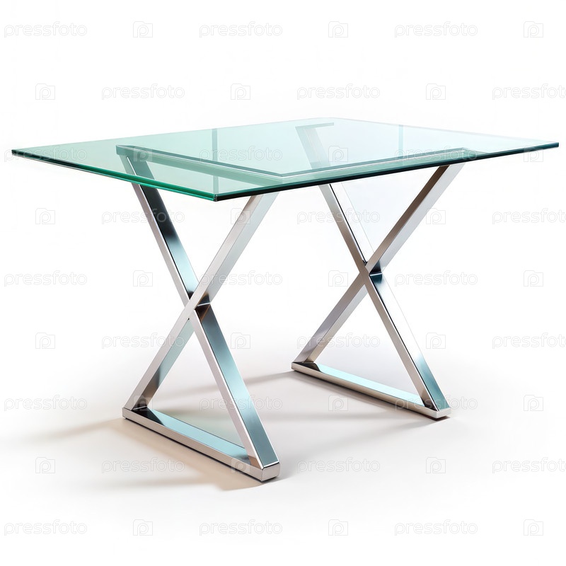 Гладкий стеклянный стол с крестообразной металлической базой на белом фоне