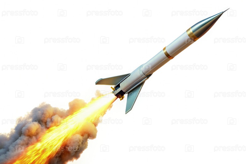 Белая ракета, запущенная с дымовым следом на белом фоне