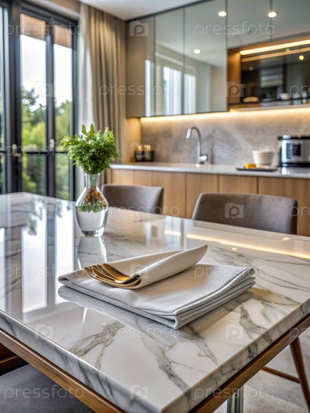 Свернутая салфетка на мраморной столешнице в современной кухне