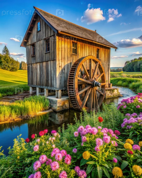 Древняя деревянная гидроэлектростанция с водяным колесом и цветами в живописной обстановке