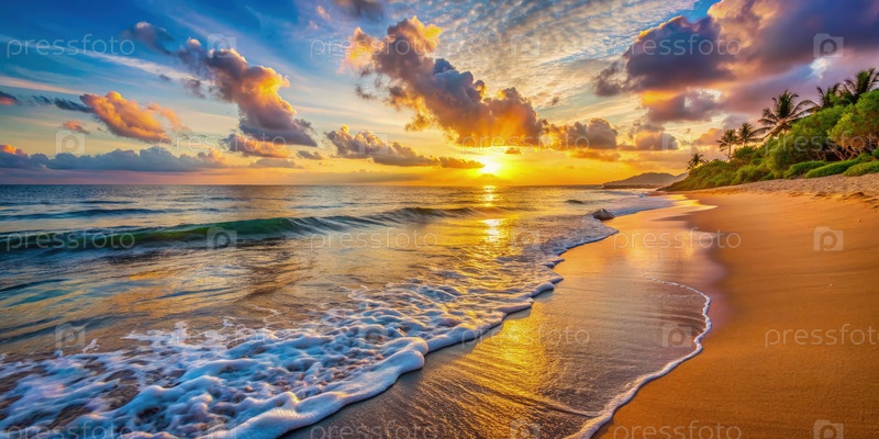 Спокойный закат солнца над спокойным пляжем с нежными волнами
