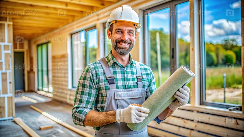 Строительный работник держит изоляционный материал в недавно построенном доме