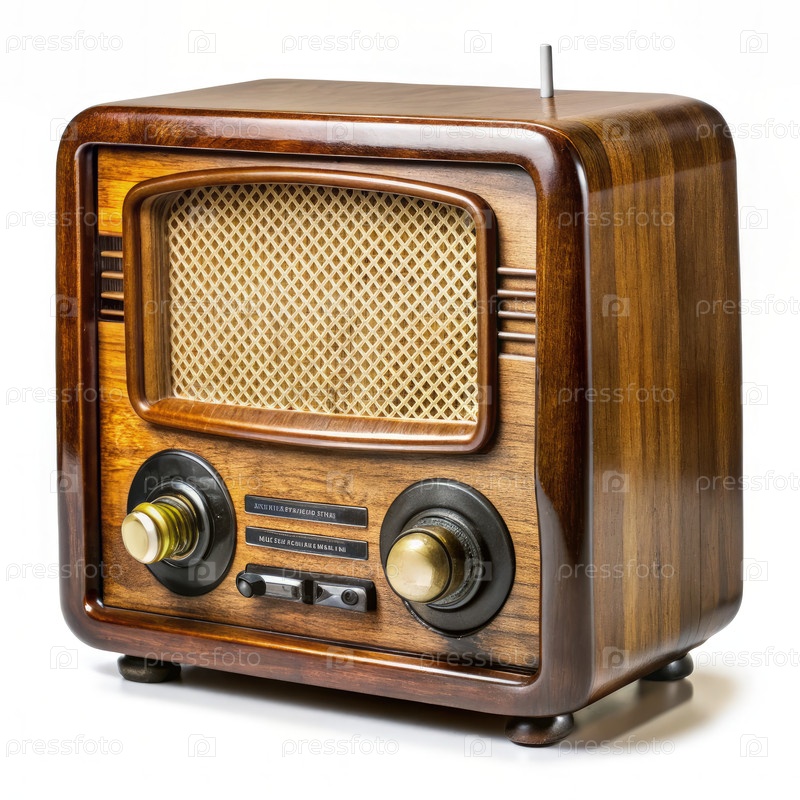 Древнее деревянное радио с гриллом для динамиков и латуниными пуговицами на белом фоне