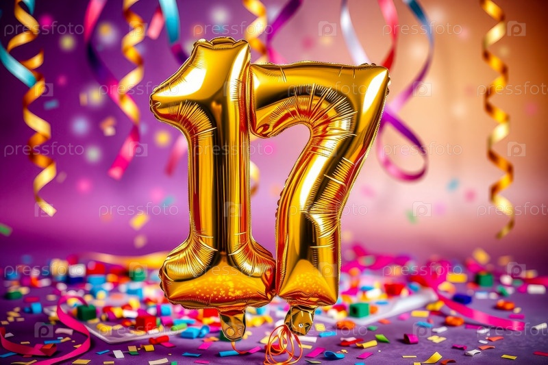 Гелиевый баллон на день рождения в форме числа семнадцать, фигура золотой буквы 17 на фоне праздничного торжества