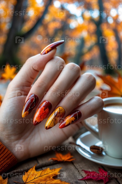AI Generative Тематический осенний маникюр в ярких пастельно-оранжевых цветах с праздничными желтыми листьями