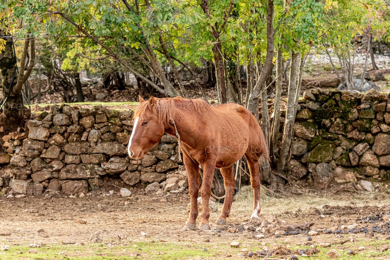 Домашняя лошадь пасется на луговой траве, ферма с животными ландшафт на открытом воздухе