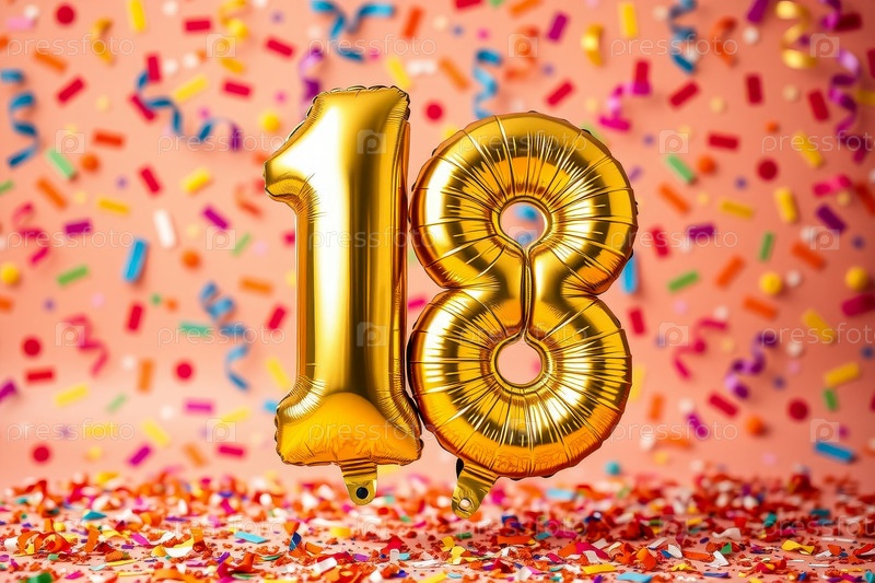 Гелиевый баллон на день рождения в форме числа восемнадцать, фигура золотой буквы 18 на фоне праздничного торжества