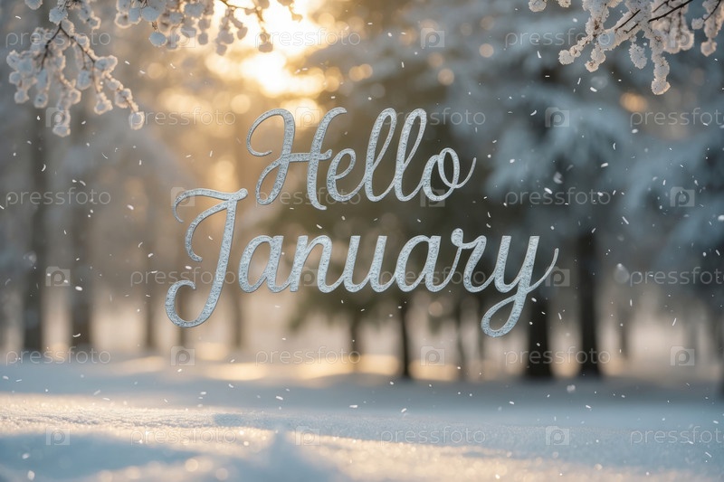 AI Generative Баннер поздравительной карточки с надписью Здравствуйте, январь на фоне снежного леса