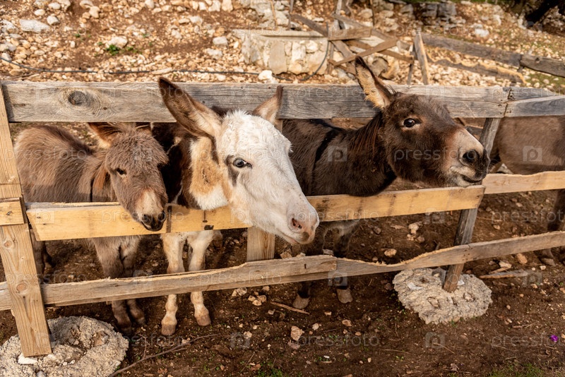 Милые пушистые ослы вытаскивали свои головы из конюшни, домашние сельскохозяйственные животные на открытом воздухе
