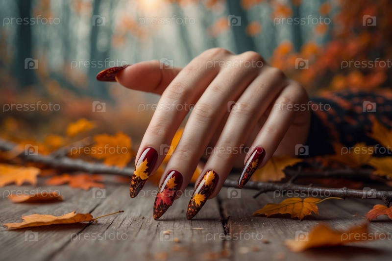 AI Generative Тематический осенний маникюр в ярких пастельно-оранжевых цветах с праздничными желтыми листьями
