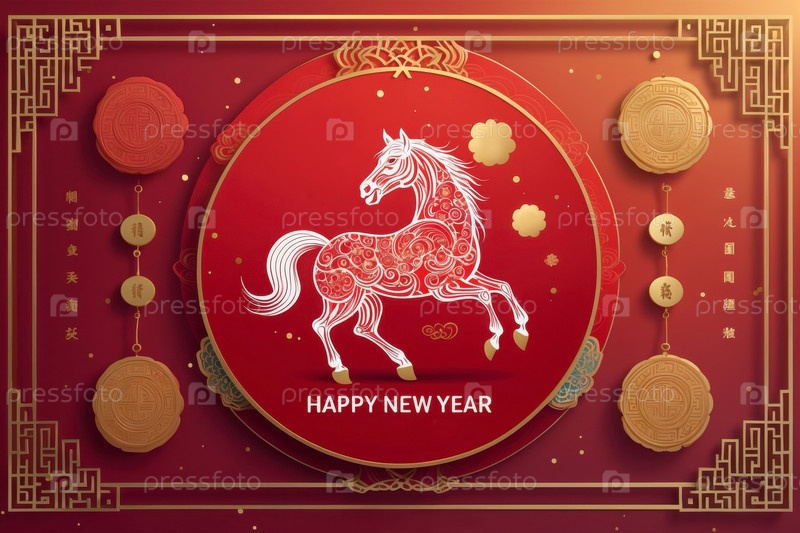 ИИ генеративная китайская праздничная новогодняя открытка поздравления с красной огненной лошадью 2026 Символы