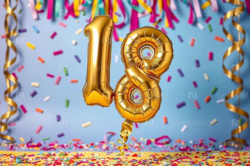 Гелиевый баллон на день рождения в форме числа восемнадцать, фигура золотой буквы 18 на фоне праздничного торжества