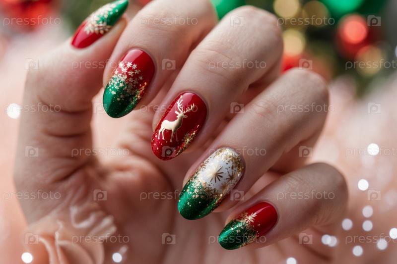Рождественский маникюр на тему ярко-красного и зеленого цвета с узорами праздничных атрибутов AI Generative