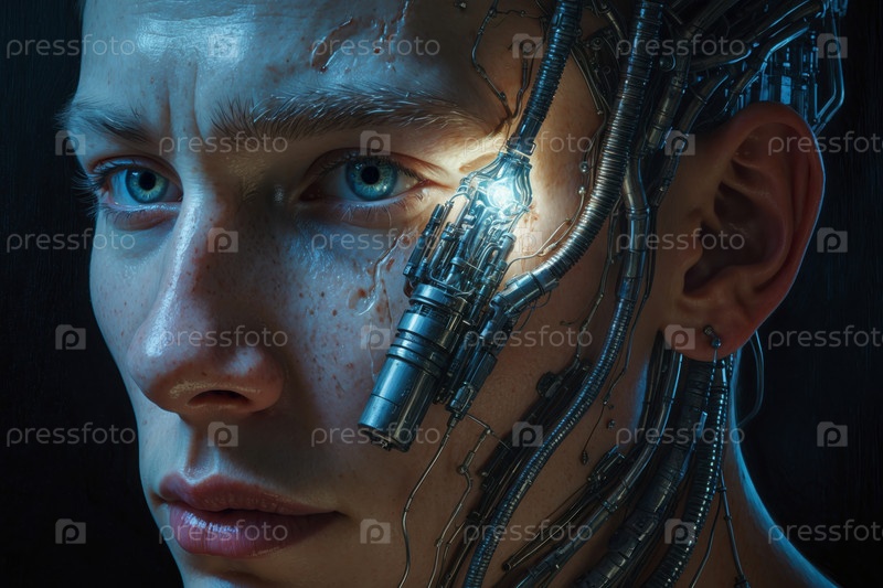 Гуманоидный футуристический механическое лицо, человек на будущем научно-фантастическом завтрашнем фоне Человек ИИ Генерирующий
