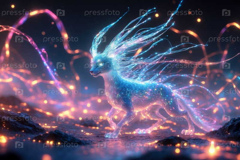 Фантастическое мифологическое животное из сказки, неоновый экзотический волшебный динозавр создание ИИ Generative