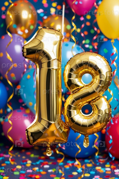 Гелиевый баллон на день рождения в форме числа восемнадцать, фигура золотой буквы 18 на фоне праздничного торжества