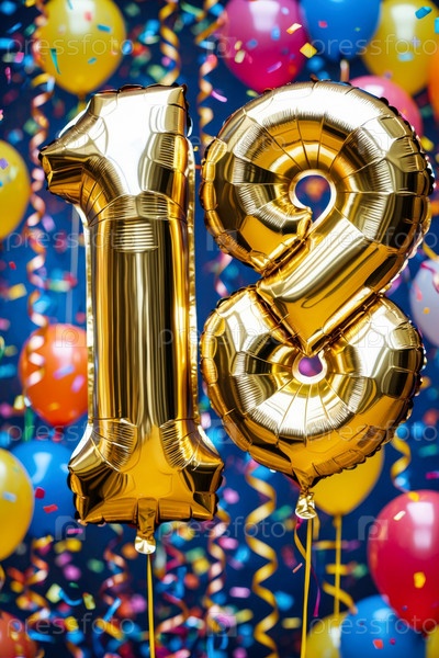 Гелиевый баллон на день рождения в форме числа восемнадцать, фигура золотой буквы 18 на фоне праздничного торжества