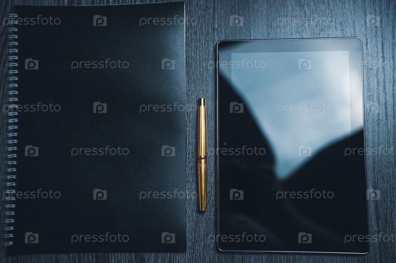 Рабочее место.Ноутбук с ручкой и планшетом на деревянном столе.Строгий стиль