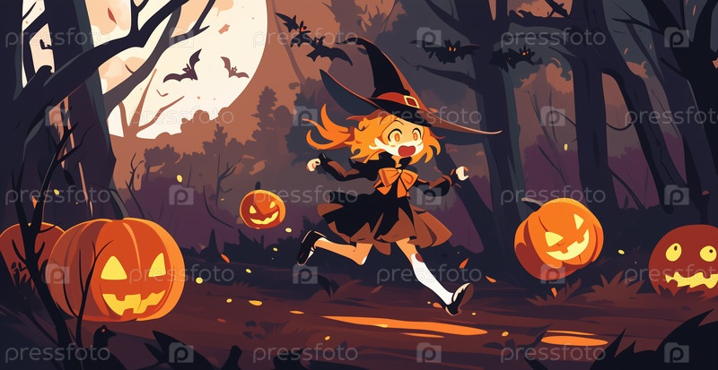 Милая ведьма бегает по тыквенному лесу в ночь Хэллоуина