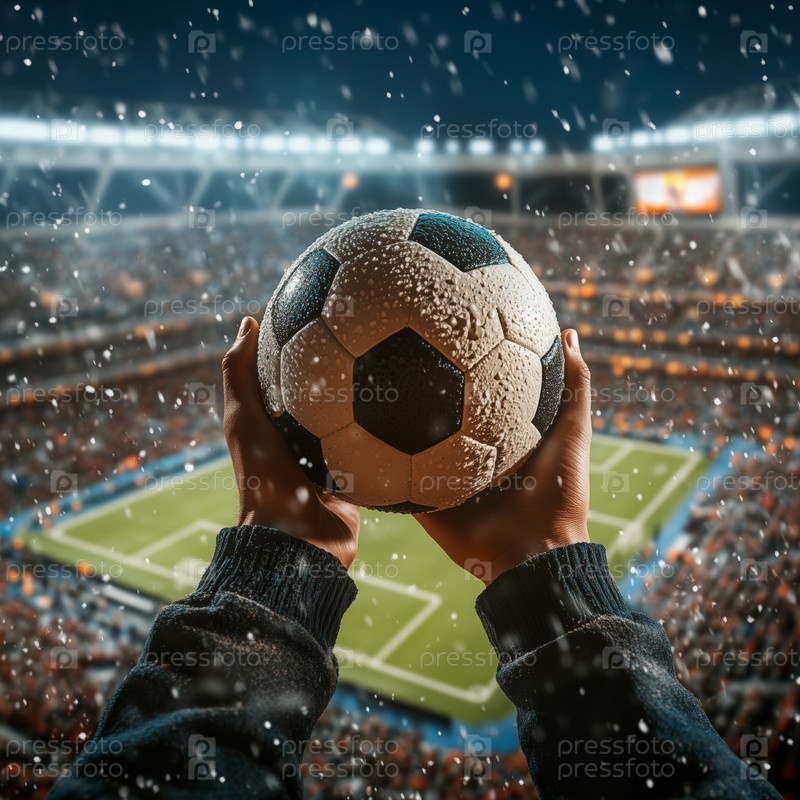 Рука, держащая футбольный мяч на переполненном стадионе