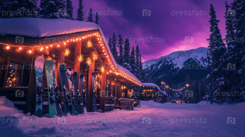 Уютный горный домик со лыжами и праздничными огнями под звездным небом