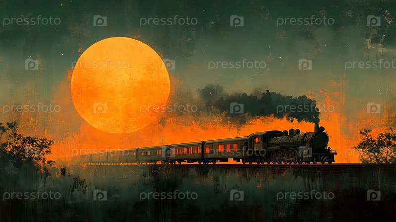 Силуэт поезда под огромной светящейся оранжевой луной