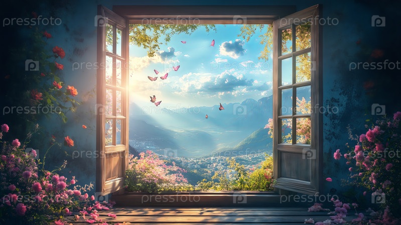 Откройте окно с цветущими цветами и бабочками на восходе солнца