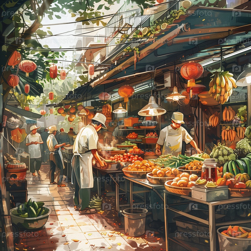 Азиатский уличный рынок еды, приготовление пищи на свежем воздухе, рынки с продуктами
