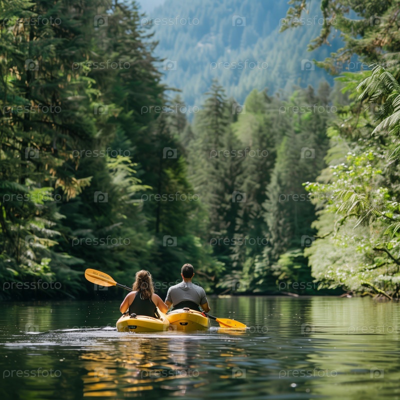 Пара катается на байдарках вниз по реке при закате