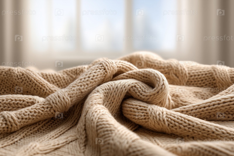 Бежевое вязаное шерстяное одеяло с кабельным узором в уютной комнате