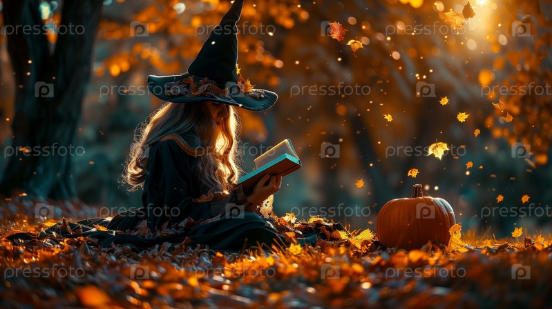 Девушка в колдовской шляпе читает книгу в осеннем лесу