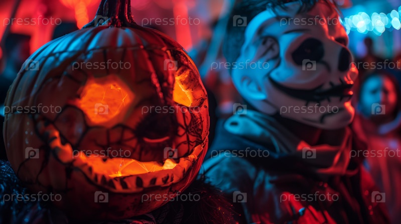 Хэллоуинская вечеринка с людьми в костюмах и тыквенных украшениях