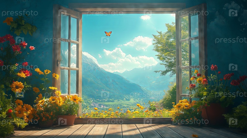 Вид с открытого окна на красочный цветочный сад и горы