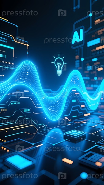 Яркие синие волны пульсируют через виртуальный городской пейзаж, демонстрируя пересечение искусственного интеллекта и инноваций, одновременно подчеркивая бесконечные возможности и идеи Генеративный ИИ