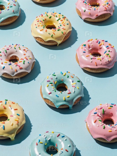 Красочные пончики, украшенные яркой глазурью и игривыми посыпаниями лежат на мягкой синей поверхности, приглашая наслаждение и сладкое удовольствие на любом собрании или празднике Generative AI