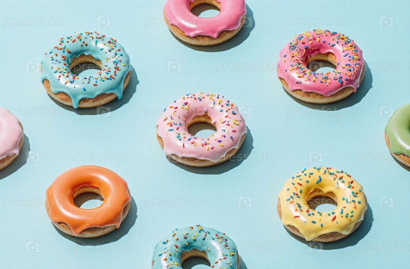 Яркий выбор пончиков сидит на ярко-синей поверхности, каждая из которых украшена различными красочными глазурами и посыпаниями, приглашая всех насладиться сладкой радостью Generative AI