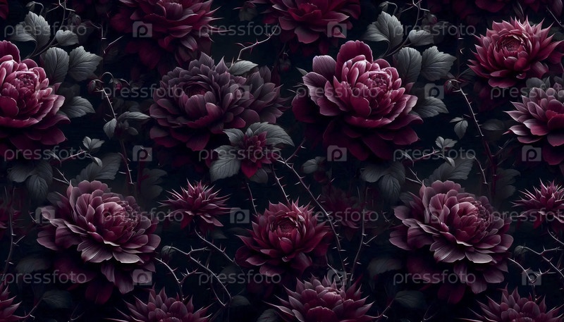 Темно-капризный цветочный бесшовный рисунок с сливовыми и бургундскими цветами на черном, Ai generated image